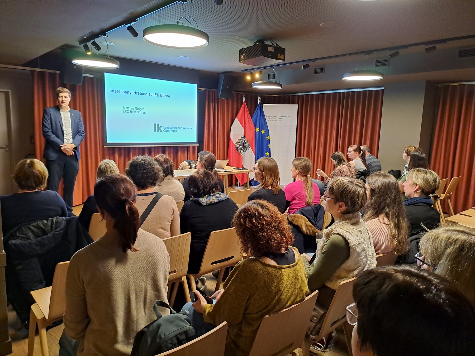 In insgesamt 80 Lehreinheiten haben die Bäuerinnen und ein Bauer aus Niederösterreich, Oberösterreich und Kärnten im vergangenen Jahr ihre Führungskompetenzen ausgebaut. Sie haben an ihrer Persönlichkeitsbildung gearbeitet, und sie wurden in Agrarpolitik und Agrarwirtschaft sowie in PR & Öffentlichkeitsarbeit geschult. Mit diesen Fähigkeiten ausgestattet, können sie ihr kreatives und innovatives Potenzial für sich persönlich, ihre Gemeinde, ihren Berufsstand oder die ländlichen Regionen insgesamt einsetzen. Der Abschluss dieses dreimonatigen Zertifikatslehrganges "ZAMm unterwegs - Professionelle Vertretungsarbeit im ländlichen Raum" führte insgesamt 40 Absoventinnen zu einem freiwilligen Studienaufenthalt nach Brüssel, wo sie von 14. bis 16. November 2023 ein straffes Programm absolvierten. Besucht wurden unter anderem die Ständige Vertretung Österreichs zur EU, der Rat der Europäischen Union und das EU-Parlament.