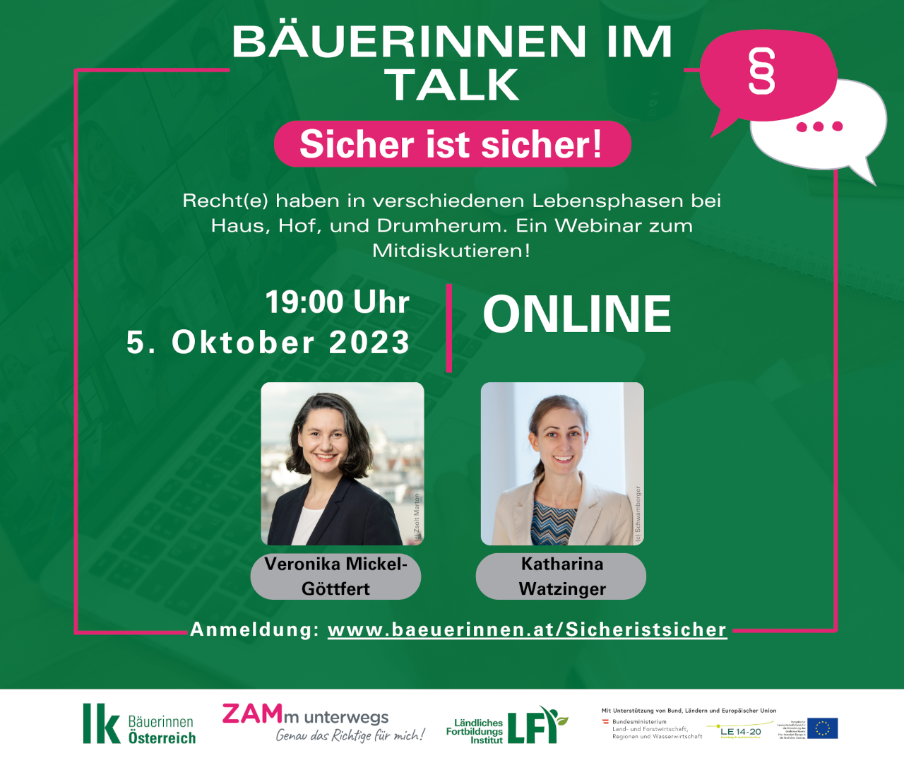 Im Laufe unseres Lebens treffen wir zahlreiche rechtliche Entscheidungen, die langfristige Auswirkungen auf unsere finanzielle Sicherheit haben können. Manche dieser Entscheidungen entfalten ihre Wirkung möglicherweise erst im fortgeschrittenen Alter, wenn nur noch begrenzte Handlungsmöglichkeiten vorhanden sind. Beim Online-Talk der Bäuerinnen zum Schwerpunkt “Sicher ist sicher!“ beleuchteten Fachexpertinnen rechtliche und sozialrechtliche Herausforderungen im eigenen Leben sowie im bäuerlichen Alltag.
