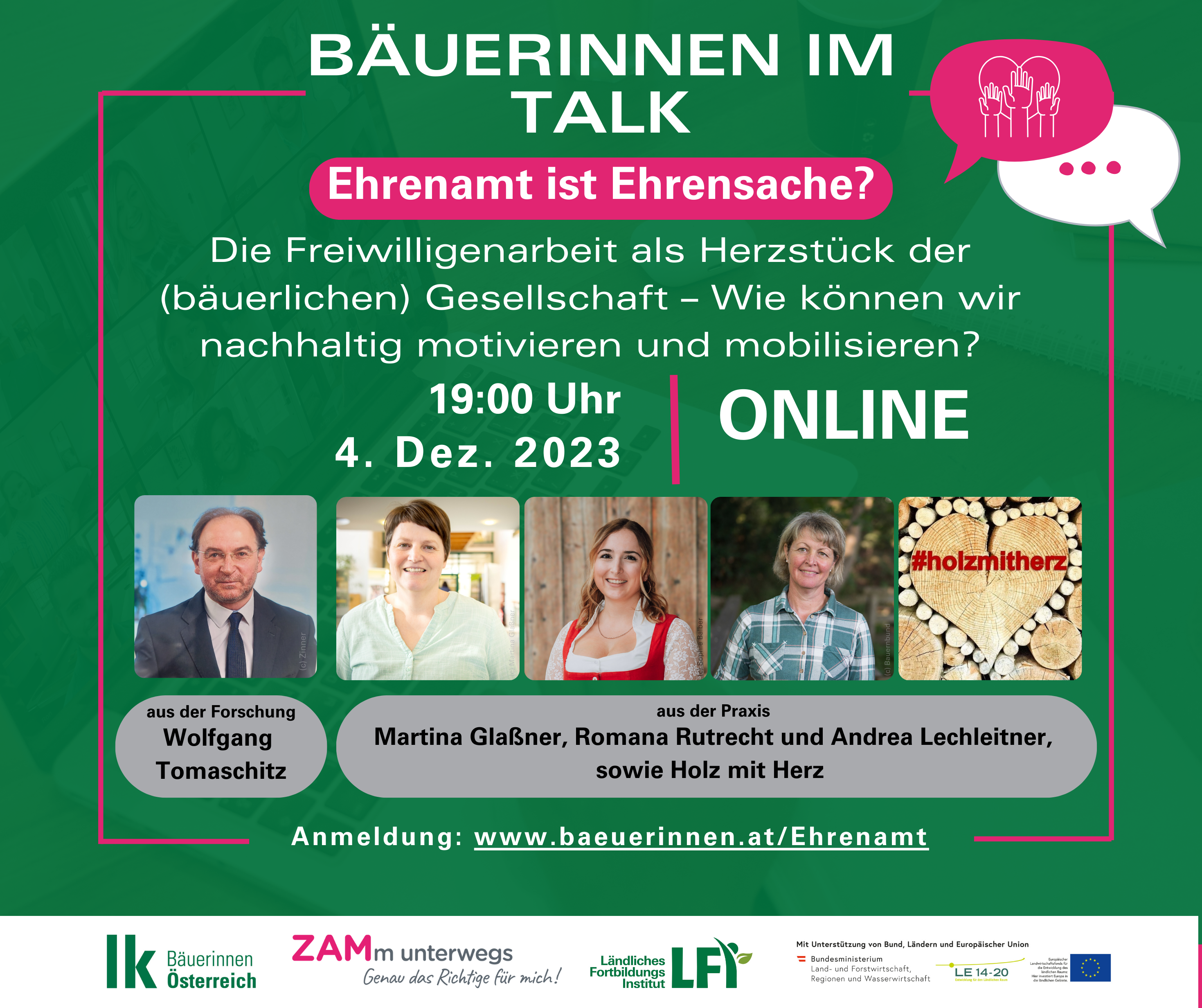 Beim Online-Talk der Bäuerinnen zum Schwerpunkt “Ehrenamt“ schauen wir uns den aktuellen Stand und die Entwicklungen der Freiwilligenarbeit aus der Forschungsperspektive und aus der Praxis an. Dazu haben wir Praktikerinnen eingeladen, die uns über ihr Ehrenamt berichten. Wir wollen herausfinden, worin der Mehrwert des Ehrenamts besteht und wie wir Personen motivieren können, sich - in der Bäuerinnenorganisation - zu engagieren.